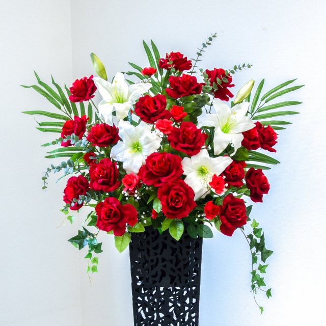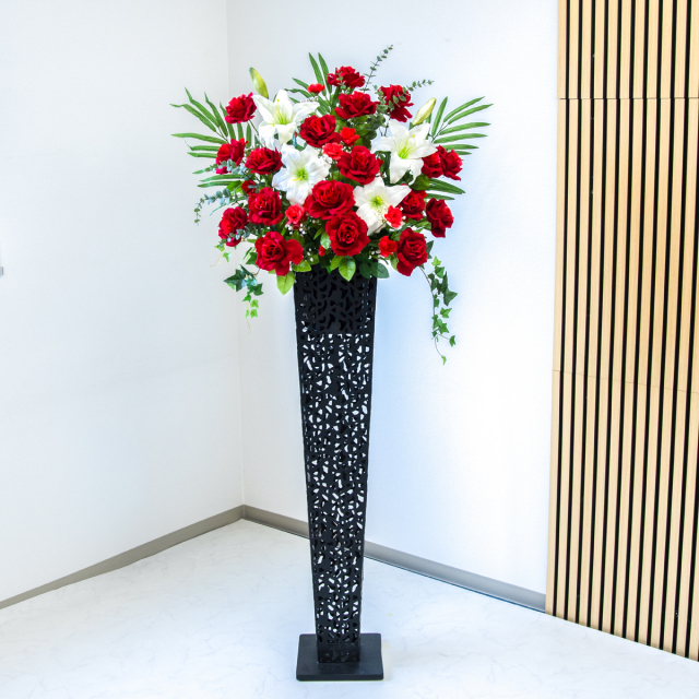 法人・店舗向けに設計された、フェイクフラワーを使用したスタンド装飾です。