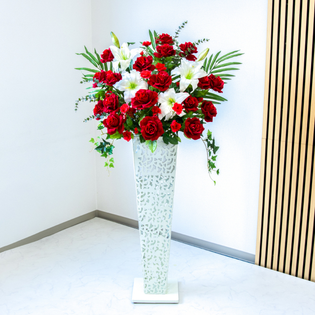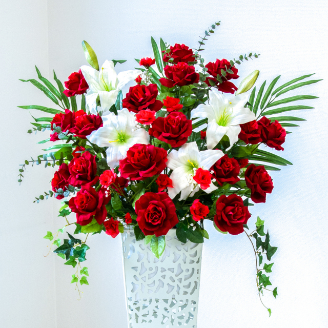 TOP クーポン対象 GG ミックス 造花フラワーアレンジメント造花スタンドアレンジフラワー/Tall【~160cm】 造花 スタンド アレンジ H約140cm 開店 開業 移転 祝い 装飾 フラワー 花 ギフト プレゼント アレンジメント フェイク 店舗 住宅展示場 モデルハウス ホテル [お祝い立札無料] 大型 通年【PA438-IR90WH 造花スタンドアレンジ(ローズ・etc)/アイアンスタンド90WH】 価格: ¥36,630 (税込) 販売期間: 日時指定について: 送り状伝票に希望としての記載は可能ですが、配送会社の状況、交通状況、天候状況により到着日時は保証しておりませんのでご了承ください。 選択してください 了承しました お届け先住所について: お届け先住所に誤りがある場合や発送後の住所変更は別途有料配送料金がかかります。(配送時に配送業者への直接払いとなります) 選択してください 了承しました ご利用案内: 当店のご利用案内を確認しました 選択してください 確認した お祝い立札デザイン: ご希望のデザイン、または不要かをお選びください。※記載内容は「備考欄」にご記載ください。 選択してください 不要 ◆デザインA(縦書き) ◆デザインB(横書き) ◆おまかせ 数量: 個 在庫: 8個 在庫 8個 返品についての詳細はこちら (PA438-IR90WH)【商品サイズ】H約140cm×W約80cm(スタンドサイズ:□23cm/H約90cm) サイズ別 造花スタンド・フラワーアレンジメント 一覧 【ご利用案内】 詳細はこちらからご確認ください