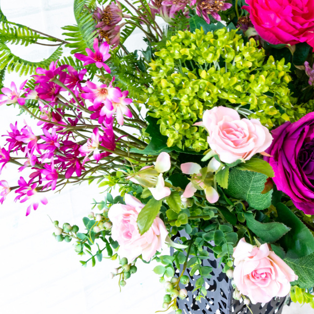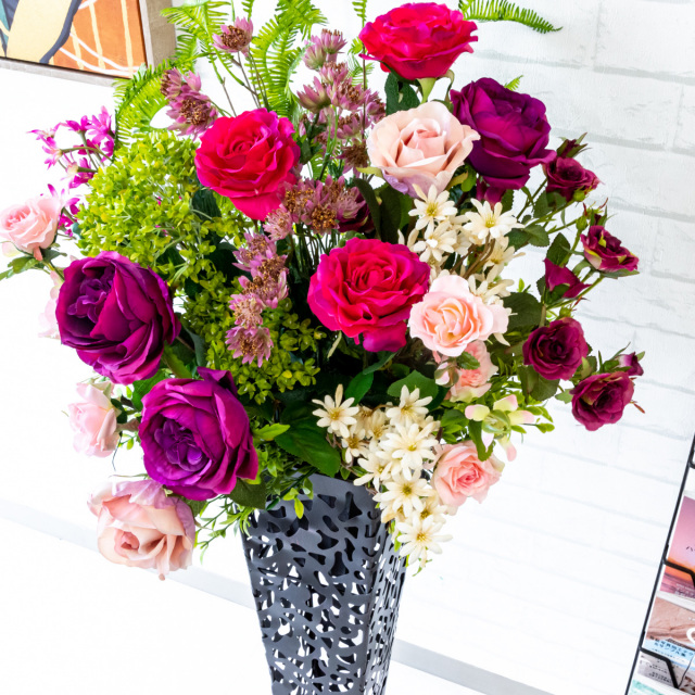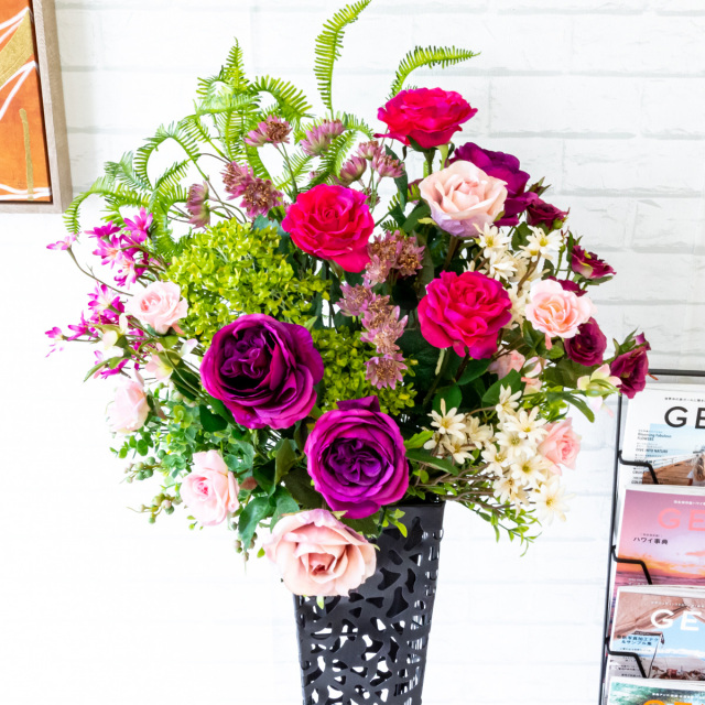 TOP クーポン対象 GG ミックス 造花フラワーアレンジメント造花スタンドアレンジフラワー/Medium【~130cm】 【立札無料】造花スタンド H約110cm / 開店祝い 開業祝い 祝い花 空間装飾 店舗装飾/PA474-IR72BK 価格: ¥16,500 (税込) 販売期間: 日時指定について: 送り状伝票に希望としての記載は可能ですが、配送会社の状況、交通状況、天候状況により到着日時は保証しておりませんのでご了承ください。 選択してください 了承しました お届け先住所について: お届け先住所に誤りがある場合や発送後の住所変更は別途有料配送料金がかかります。(配送時に配送業者への直接払いとなります) 選択してください 了承しました ご利用案内: 当店のご利用案内を確認しました 選択してください 確認した お祝い立札デザイン: ご希望のデザイン、または不要かをお選びください。※記載内容は「備考欄」にご記載ください。 選択してください 不要 ◆デザインA(縦書き) ◆デザインB(横書き) ◆おまかせ 数量: 個 在庫: 2個 在庫 2個 返品についての詳細はこちら (PA474-IR72BK)【商品サイズ】H約110cm×W約45cm(スタンドサイズ:□15cm/H約74cm) サイズ別 造花スタンド・フラワーアレンジメント 一覧 【ご利用案内】 詳細はこちらからご確認ください