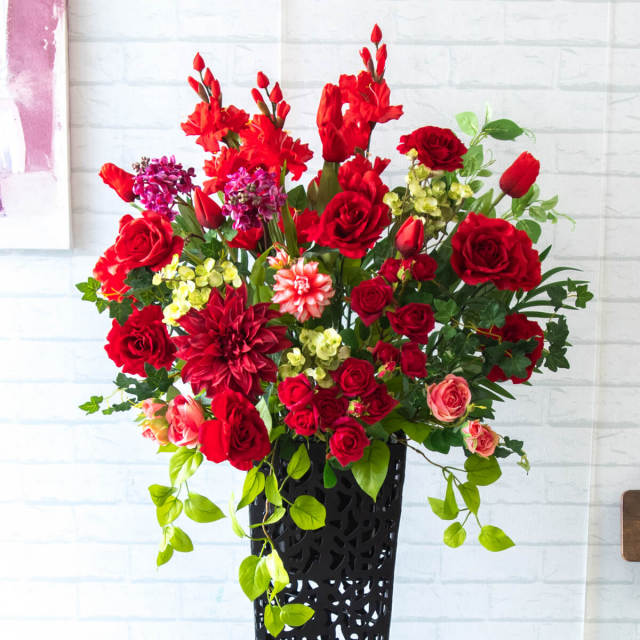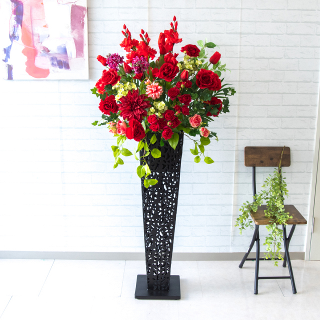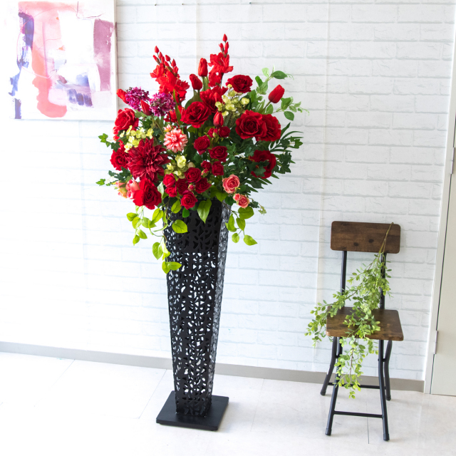 法人・店舗向けに設計された、フェイクフラワーを使用したスタンド装飾です。