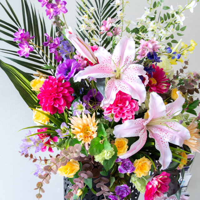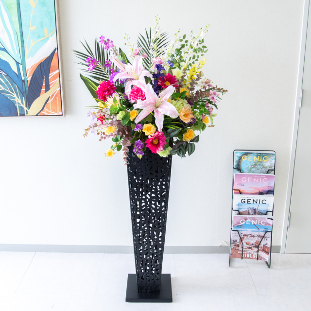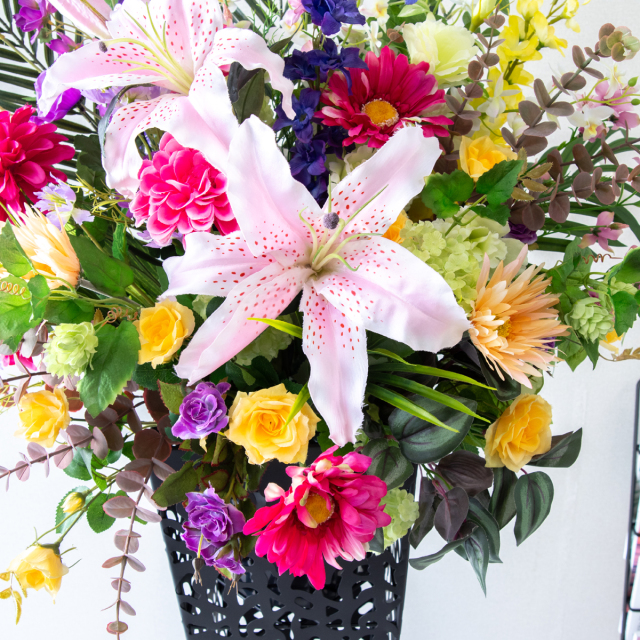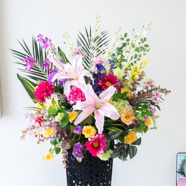 TOP クーポン対象 GG 通年 造花フラワーアレンジメント造花スタンドアレンジフラワー/Tall【~160cm】 造花 スタンド アレンジ H約140cm 開店 開業 移転 祝い 装飾 フラワー 花 ギフト プレゼント アレンジメント フェイク 店舗 住宅展示場 モデルハウス ホテル [お祝い立札無料] 通年【PA835-IR90BK 造花スタンドアレンジ(カサブランカ・ガーベラ)/アイアンスタンド90BK】 価格: ¥42,130 (税込) 販売期間: 日時指定について: 送り状伝票に希望としての記載は可能ですが、配送会社の状況、交通状況、天候状況により到着日時は保証しておりませんのでご了承ください。 選択してください 了承しました お届け先住所について: お届け先住所に誤りがある場合や発送後の住所変更は別途有料配送料金がかかります。(配送時に配送業者への直接払いとなります) 選択してください 了承しました ご利用案内: 当店のご利用案内を確認しました 選択してください 確認した お祝い立札デザイン: ご希望のデザイン、または不要かをお選びください。※記載内容は「備考欄」にご記載ください。 選択してください 不要 ◆デザインA(縦書き) ◆デザインB(横書き) ◆おまかせ 数量: 個 在庫: 1個 在庫 1個 返品についての詳細はこちら (PA835-IR90BK)【商品サイズ】H約140cm×W約70cm(スタンドサイズ:□23cm/H約90cm) サイズ別 造花スタンド・フラワーアレンジメント 一覧 【ご利用案内】 詳細はこちらからご確認ください