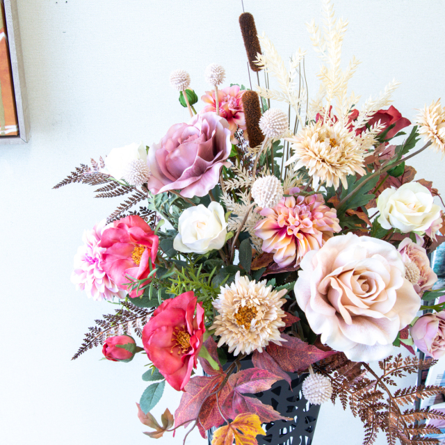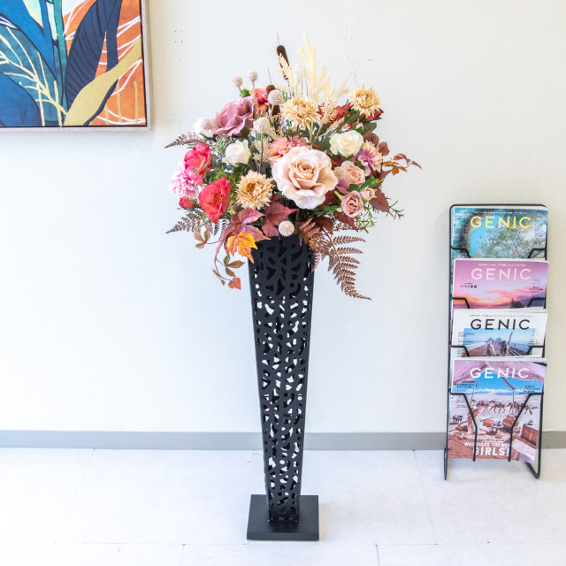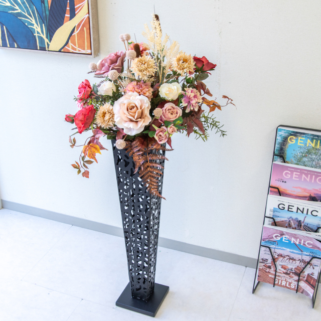 TOP クーポン対象 GG ミックス 造花フラワーアレンジメント造花スタンドアレンジフラワー/Medium【~130cm】 造花 スタンド アレンジ H約110cm 開店 開業 移転 祝い 装飾 フラワー 花 ギフト プレゼント アレンジメント フェイク 店舗 住宅展示場 モデルハウス ホテル [お祝い立札無料] 【PA906-IR72BK 造花スタンドアレンジ(ローズ・ダリア)/アイアンスタンド72BK】 価格: ¥19,360 (税込) 販売期間: 日時指定について: 送り状伝票に希望としての記載は可能ですが、配送会社の状況、交通状況、天候状況により到着日時は保証しておりませんのでご了承ください。 選択してください 了承しました お届け先住所について: お届け先住所に誤りがある場合や発送後の住所変更は別途有料配送料金がかかります。(配送時に配送業者への直接払いとなります) 選択してください 了承しました ご利用案内: 当店のご利用案内を確認しました 選択してください 確認した お祝い立札デザイン: ご希望のデザイン、または不要かをお選びください。※記載内容は「備考欄」にご記載ください。 選択してください 不要 ◆デザインA(縦書き) ◆デザインB(横書き) ◆おまかせ 数量: 個 在庫: 1個 在庫 1個 返品についての詳細はこちら (PA906-IR72BK)【商品サイズ】H約110cm×W約50cm(スタンドサイズ:□15cm/H約74cm) サイズ別 造花スタンド・フラワーアレンジメント 一覧 【ご利用案内】 詳細はこちらからご確認ください