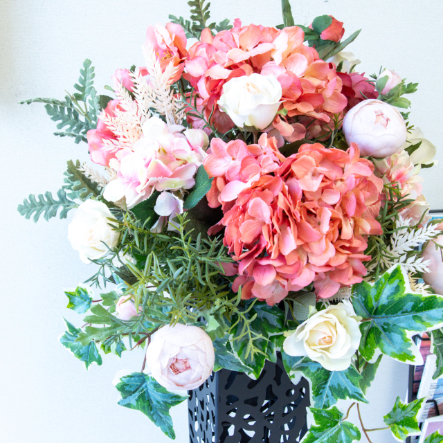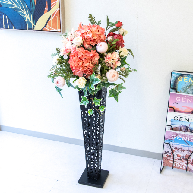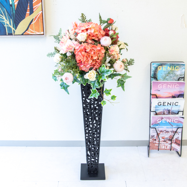 TOP クーポン対象 GG ミックス 造花フラワーアレンジメント造花スタンドアレンジフラワー/Medium【~130cm】 造花 スタンド アレンジ H約100cm 開店 開業 移転 祝い 装飾 フラワー 花 ギフト プレゼント アレンジメント フェイク 店舗 住宅展示場 モデルハウス ホテル [お祝い立札無料] 【PA908-IR72BK 造花スタンドアレンジ(アジサイ・ローズ)/アイアンスタンド72BK】 価格: ¥21,780 (税込) 販売期間: 日時指定について: 送り状伝票に希望としての記載は可能ですが、配送会社の状況、交通状況、天候状況により到着日時は保証しておりませんのでご了承ください。 選択してください 了承しました お届け先住所について: お届け先住所に誤りがある場合や発送後の住所変更は別途有料配送料金がかかります。(配送時に配送業者への直接払いとなります) 選択してください 了承しました ご利用案内: 当店のご利用案内を確認しました 選択してください 確認した お祝い立札デザイン: ご希望のデザイン、または不要かをお選びください。※記載内容は「備考欄」にご記載ください。 選択してください 不要 ◆デザインA(縦書き) ◆デザインB(横書き) ◆おまかせ 数量: 個 在庫: 1個 在庫 1個 返品についての詳細はこちら (PA908-IR72BK)【商品サイズ】H約100cm×W約45cm(スタンドサイズ:□15cm/H約74cm) サイズ別 造花スタンド・フラワーアレンジメント 一覧 【ご利用案内】 詳細はこちらからご確認ください