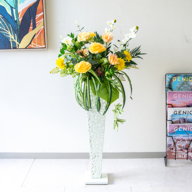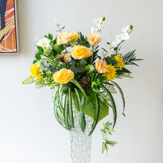 TOP クーポン対象 GG ミックス 造花フラワーアレンジメント造花スタンドアレンジフラワー/Medium【~130cm】 【立札無料】造花スタンド H約110cm / 開店祝い 開業祝い 祝い花 空間装飾 店舗装飾/PA914-IR72WH 価格: ¥22,550 (税込) 販売期間: 日時指定について: 送り状伝票に希望としての記載は可能ですが、配送会社の状況、交通状況、天候状況により到着日時は保証しておりませんのでご了承ください。 選択してください 了承しました お届け先住所について: お届け先住所に誤りがある場合や発送後の住所変更は別途有料配送料金がかかります。(配送時に配送業者への直接払いとなります) 選択してください 了承しました ご利用案内: 当店のご利用案内を確認しました 選択してください 確認した お祝い立札デザイン: ご希望のデザイン、または不要かをお選びください。※記載内容は「備考欄」にご記載ください。 選択してください 不要 ◆デザインA(縦書き) ◆デザインB(横書き) ◆おまかせ 数量: 個 在庫: 2個 在庫 2個 返品についての詳細はこちら (PA914-IR72WH)【商品サイズ】H約110cm×W約50cm(スタンドサイズ:□15cm/H約74cm) サイズ別 造花スタンド・フラワーアレンジメント 一覧 【ご利用案内】 詳細はこちらからご確認ください