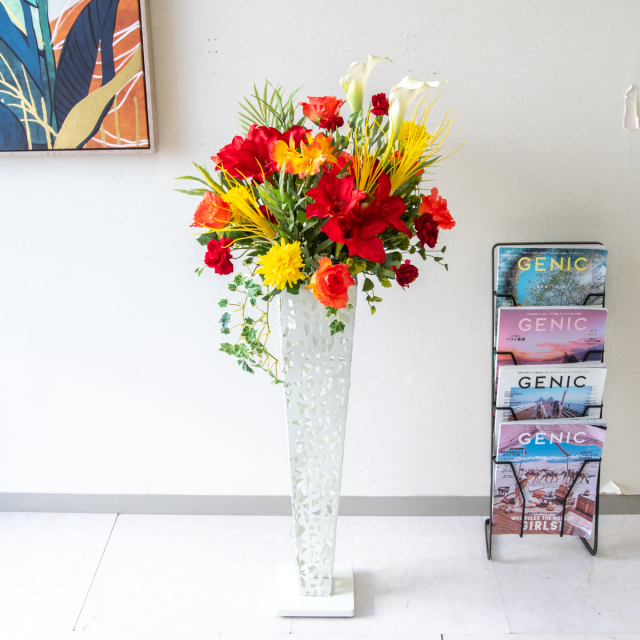 TOP クーポン対象 GG ミックス 造花フラワーアレンジメント造花スタンドアレンジフラワー/Medium【~130cm】 【立札無料】造花スタンド H約110cm / 開店祝い 開業祝い 祝い花 空間装飾 店舗装飾/PA916-IR72WH 価格: ¥19,800 (税込) 販売期間: 日時指定について: 送り状伝票に希望としての記載は可能ですが、配送会社の状況、交通状況、天候状況により到着日時は保証しておりませんのでご了承ください。 選択してください 了承しました お届け先住所について: お届け先住所に誤りがある場合や発送後の住所変更は別途有料配送料金がかかります。(配送時に配送業者への直接払いとなります) 選択してください 了承しました ご利用案内: 当店のご利用案内を確認しました 選択してください 確認した お祝い立札デザイン: ご希望のデザイン、または不要かをお選びください。※記載内容は「備考欄」にご記載ください。 選択してください 不要 ◆デザインA(縦書き) ◆デザインB(横書き) ◆おまかせ 数量: 個 在庫: 1個 在庫 1個 返品についての詳細はこちら (PA916-IR72WH)【商品サイズ】H約110cm×W約45cm(スタンドサイズ:□15cm/H約74cm) サイズ別 造花スタンド・フラワーアレンジメント 一覧 【ご利用案内】 詳細はこちらからご確認ください