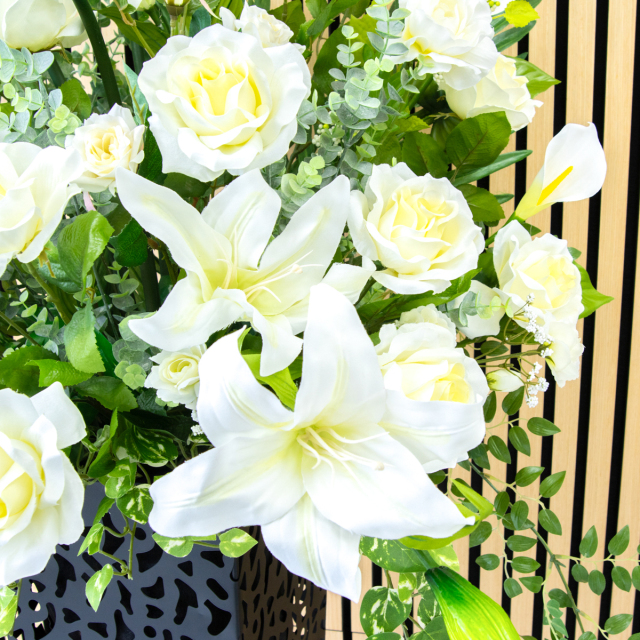 TOP クーポン対象 GG ミックス 造花フラワーアレンジメント造花スタンドアレンジフラワー/Ex-Tall【161cm~】 【立札無料】造花スタンド 大型 H約180cm / 開店祝い 開業祝い 祝い花 空間装飾 店舗装飾/PA935-IR120BK 価格: ¥47,740 (税込) 販売期間: 日時指定について: 送り状伝票に希望としての記載は可能ですが、配送会社の状況、交通状況、天候状況により到着日時は保証しておりませんのでご了承ください。 選択してください 了承しました お届け先住所について: お届け先住所に誤りがある場合や発送後の住所変更は別途有料配送料金がかかります。(配送時に配送業者への直接払いとなります) 選択してください 了承しました ご利用案内: 当店のご利用案内を確認しました 選択してください 確認した お祝い立札デザイン: ご希望のデザイン、または不要かをお選びください。※記載内容は「備考欄」にご記載ください。 選択してください 不要 ◆デザインA(縦書き) ◆デザインB(横書き) ◆おまかせ 数量: 個 在庫: 10個 在庫 10個 返品についての詳細はこちら (PA935-IR120BK)【商品サイズ】H約180cm×W約80cm(スタンドサイズ:□23cm/H約120cm) サイズ別 造花スタンド・フラワーアレンジメント 一覧 【ご利用案内】 詳細はこちらからご確認ください