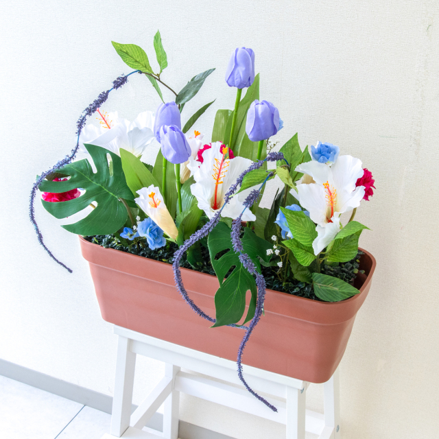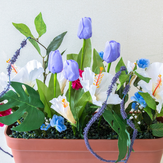 TOP クーポン対象 GG 春装飾 造花プランター造花プランター/プランター特価コーナー 造花プランター フラワープランター フラワーアレンジメント フェイクグリーン 店舗装飾 ディスプレイ パチンコ店 工事現場 住宅展示場 モデルハウス ショールーム 春装飾 ブルー/PF728-LB 造花プランター(チューリップ・ハイビ) 価格: ¥3,850 (税込) 販売期間: 日時指定について: 送り状伝票に希望としての記載は可能ですが、配送会社の状況、交通状況、天候状況により到着日時は保証しておりませんのでご了承ください。 選択してください 了承しました お届け先住所について: お届け先住所に誤りがある場合や発送後の住所変更は別途有料配送料金がかかります。(配送時に配送業者への直接払いとなります) 選択してください 了承しました ご利用案内: 当店のご利用案内を確認しました 選択してください 確認した 数量: 個 在庫: 5個 在庫 5個 返品についての詳細はこちら (PF728-LB)H約50cm×W約50cm(プランターサイズ:H約18cm×W約50cm×D約20cm) 【ご利用案内】 詳細はこちらからご確認ください