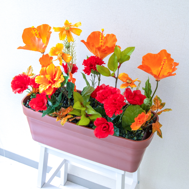 TOP クーポン対象 GG ミックス 造花プランター造花プランター/プランター特価コーナー 造花プランター フラワープランター フラワーアレンジメント フェイクグリーン 店舗装飾 ディスプレイ パチンコ店 工事現場 住宅展示場 モデルハウス ショールーム 夏装飾 オレンジ/PF819-LB 造花プランター(ハイビ・コスモス):Aプ 価格: ¥3,500 (税込 ¥3,850) 販売期間: 日時指定について: 送り状伝票に希望としての記載は可能ですが、配送会社の状況、交通状況、天候状況により到着日時は保証しておりませんのでご了承ください。 選択してください 了承しました お届け先住所について: お届け先住所に誤りがある場合や発送後の住所変更は別途有料配送料金がかかります。(配送時に配送業者への直接払いとなります) 選択してください 了承しました ご利用案内: 当店のご利用案内を確認しました 選択してください 確認した 数量: 個 在庫: 9個 在庫 9個 返品についての詳細はこちら (PF819-LB)H約45cm×W約50cm(プランターサイズ:H約18cm×W約50cm×D約20cm) 【ご利用案内】 詳細はこちらからご確認ください